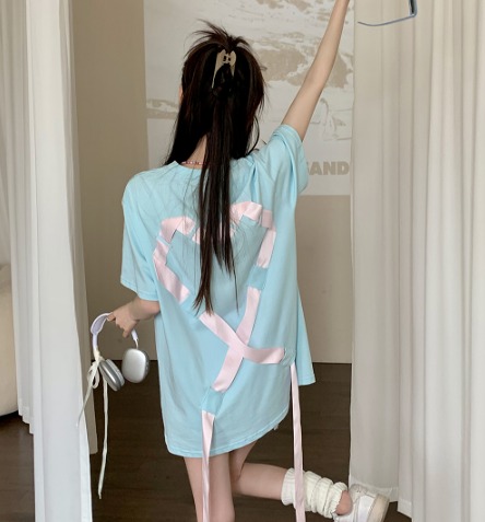 シャツ カットソー 五分 七分 半袖 ショート丈 ネック プリント 切り替え 体型カバー 原宿系ファッション 韓国風ダンス 衣装 ヒップホップ 個性 奇抜 かわいい 青文字系 トップ
