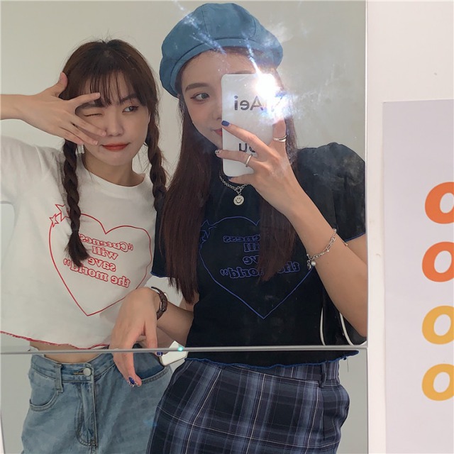 ハート半袖シャツトップス白ホワイト黒ブラックロゴレディースガールズフリルフレアレースミニヒップホップダンス衣装通学かわいいおしゃれ韓国韓国ファッション原宿ショート丈短い短めへそ出しガーリ