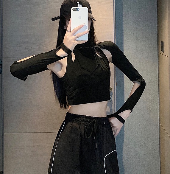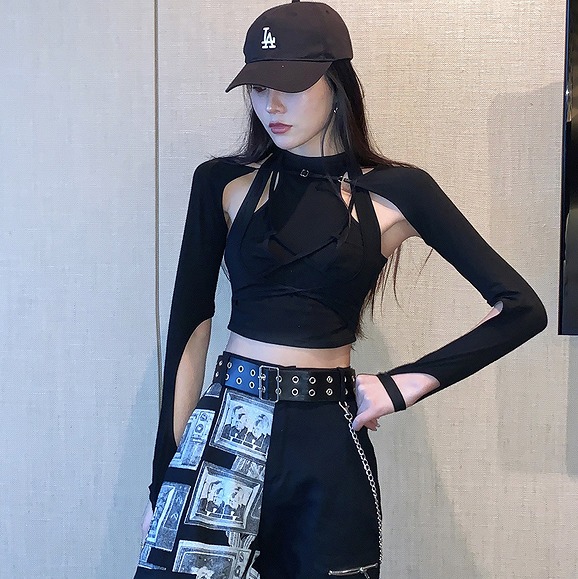 Tシャツ カットソー 長袖 ショート丈 切り替え スリム 無地 原宿系ファッション 韓国風ダンス 衣装 ヒップホップ HIPHOP 個性 奇抜 かわいい 青文字系 トップス レディース 女