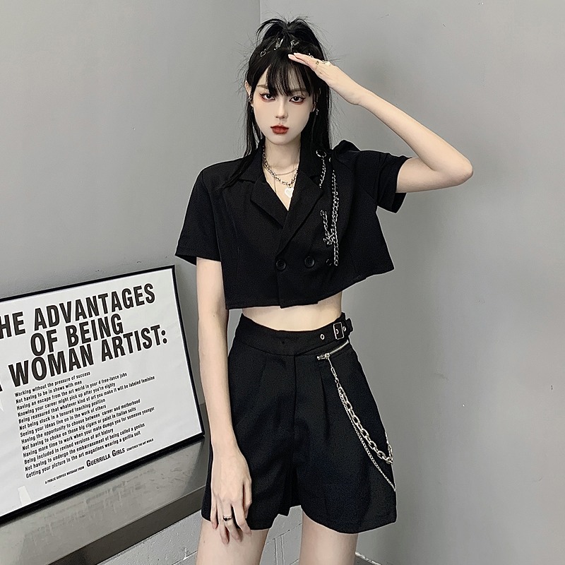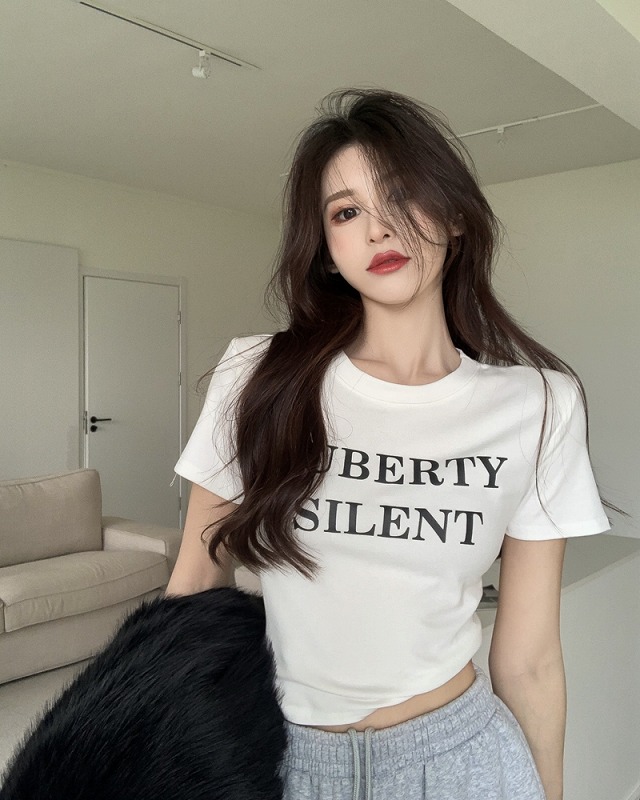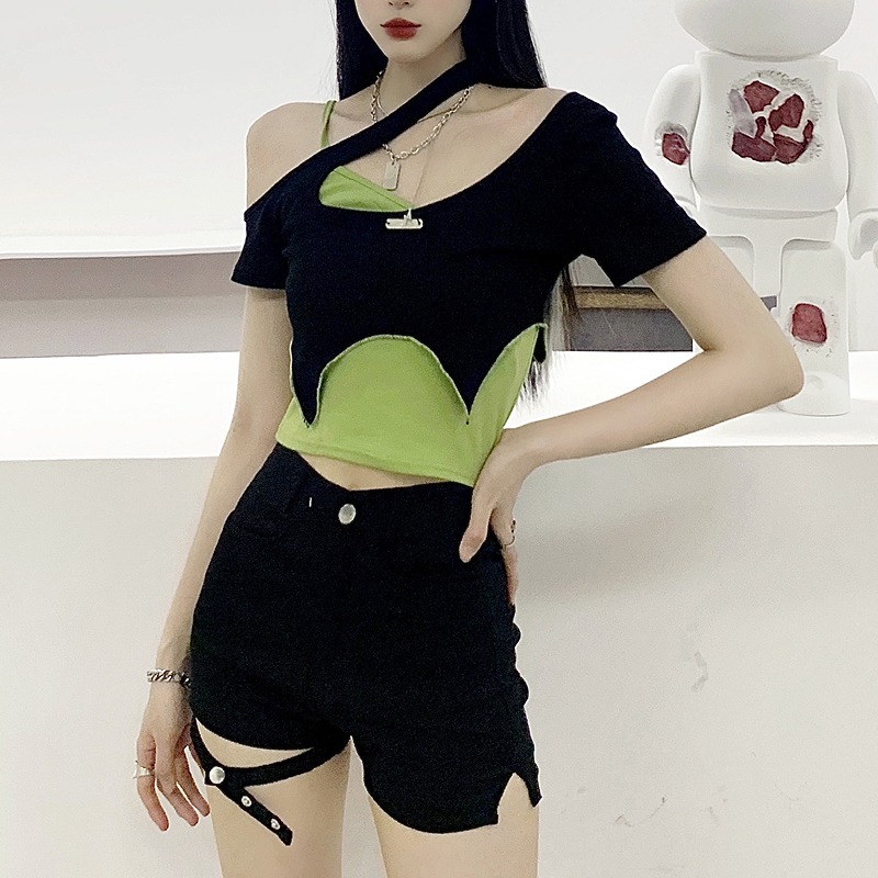 Tシャツ カットソー 五分 七分 半袖 ショート丈 切り替え スリム セクシー 原宿系ファッション 韓国風ダンス 衣装 ヒップホップ HIPHOP 個性 奇抜 かわいい 青文字系 トップス レディース