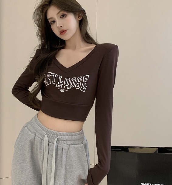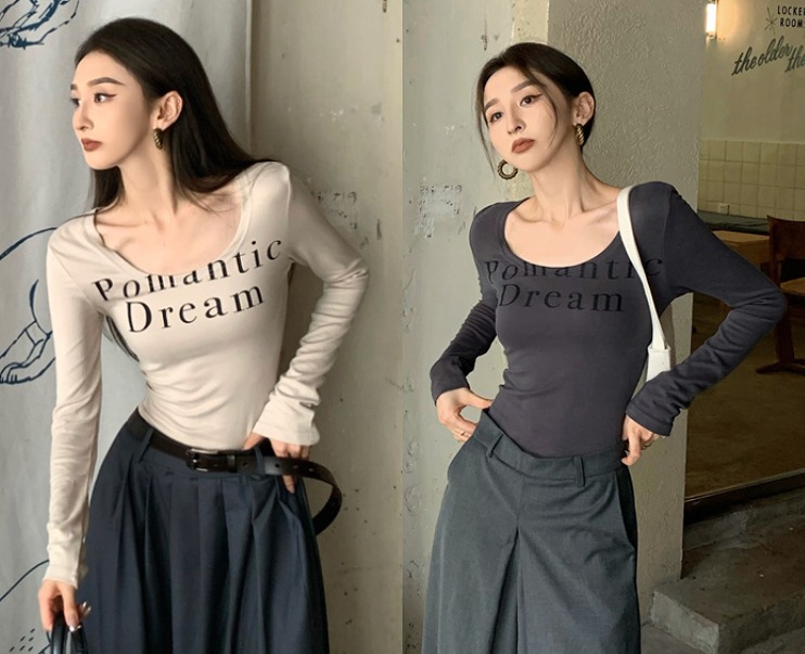 全3色 シャツ カットソー 長袖 ショート丈 プリント 切り替え スリム ロゴ 英字 原宿系ファッション 韓国風ダンス 衣装 ヒップホップ 個性 奇抜 かわいい 青文字系 ト