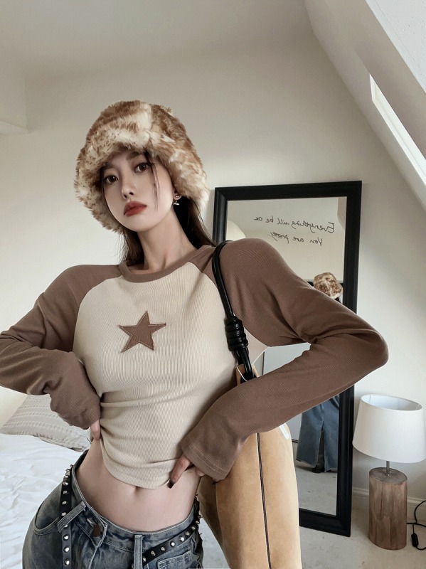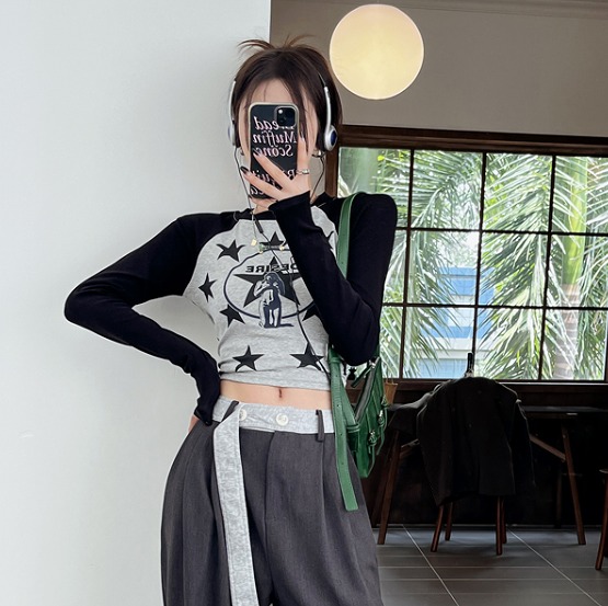 星柄シャツ カットソー 長袖 ショート丈 切り替え バイカラー 配色 スリム 原宿系ファッション 韓国風ダンス 衣装 ヒップホップ 個性 奇抜 かわいい 青文字系 トップス レディース