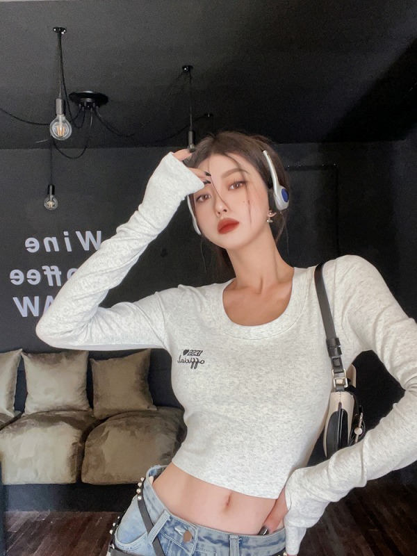 シャツ カットソー 長袖 ショート丈 切り替え スリム 刺繍 刺しゅう 原宿系ファッション 韓国風ダンス 衣装 ヒップホップ 個性 奇抜 かわいい 青文字系 トップス レディース 女