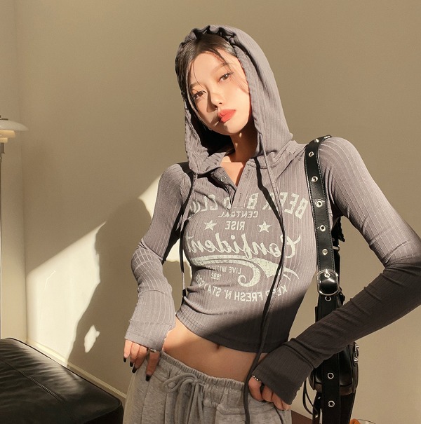 全2色 シャツ カットソー 長袖 スリム ショート丈 ロゴ 英字 帽子付き フード付 原宿系ファッション 韓国風ダンス 衣装 ヒップホップ 個性 奇抜 かわいい 青文字系 ト