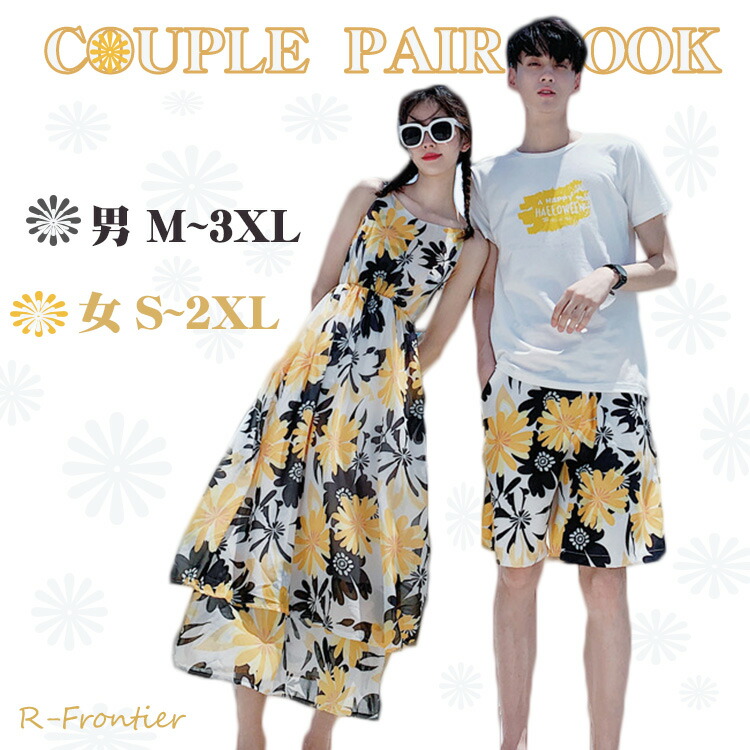 ペアルック カップル ポへミア花柄 ワンピース ペアシャツ オフショルダー 海遊び カップル 海リゾート 旅行
