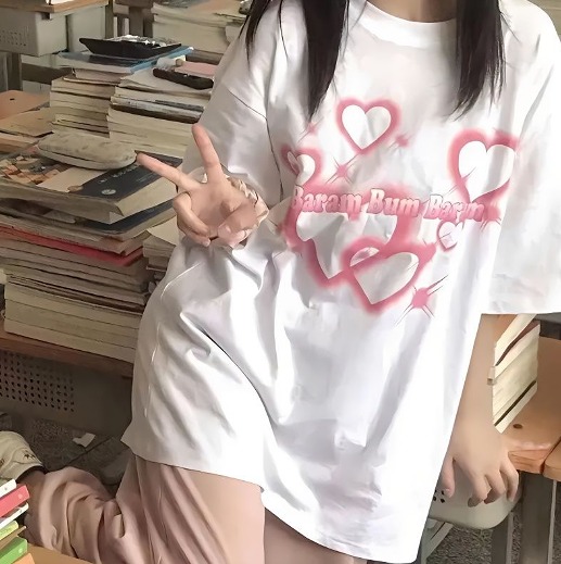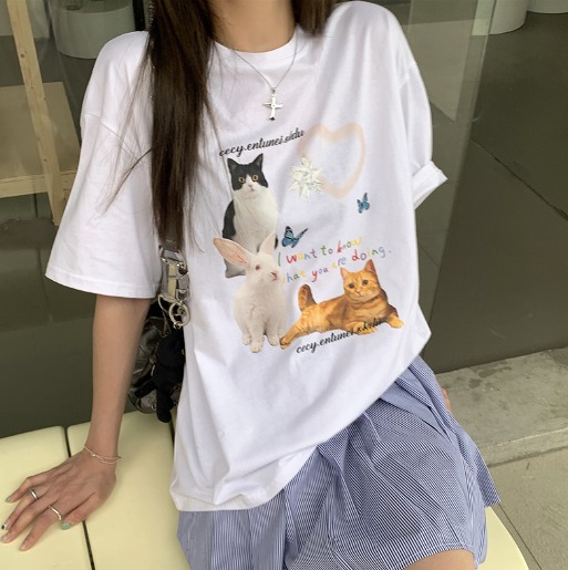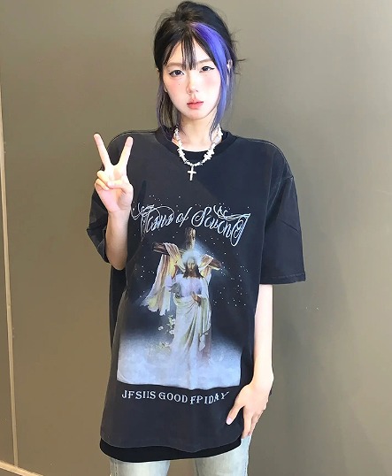 Tシャツ カットソー 五分 七分 半袖 プリント 切り替え 体型カバー 大きいサイズあり 原宿系ファッション 韓国風 ダンス 衣装 ダンサー ヒップホップ HIPHOP 個性 奇抜 かわいい 青文字系