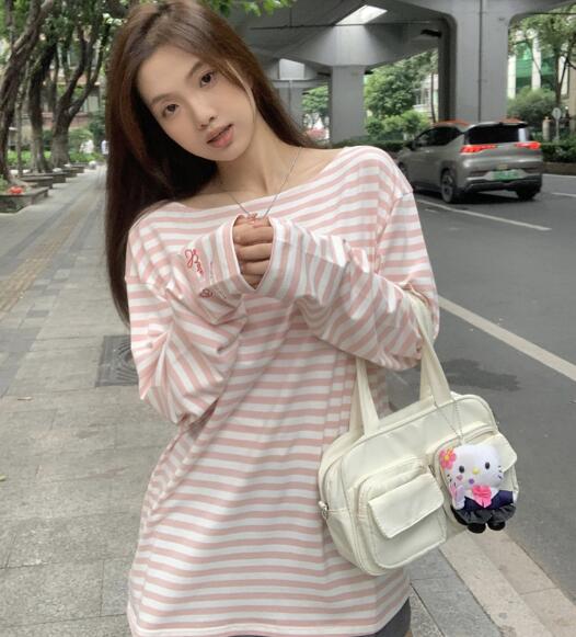 ♪~展開♪ボーダー長袖スウェットトップスカットソーTシャツピンクホワイト長めダンス衣装ヒップホップレディースガールズストリート韓国おしゃれ奇抜派手個性的