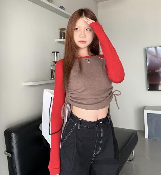 ♪~展開♪3色バイカラー長袖サイド絞りスウェットトップスカットソーTシャツレッドブラックベージュダンス衣装ヒップホップレディースガールズストリート韓国おしゃれ奇抜派手個性的