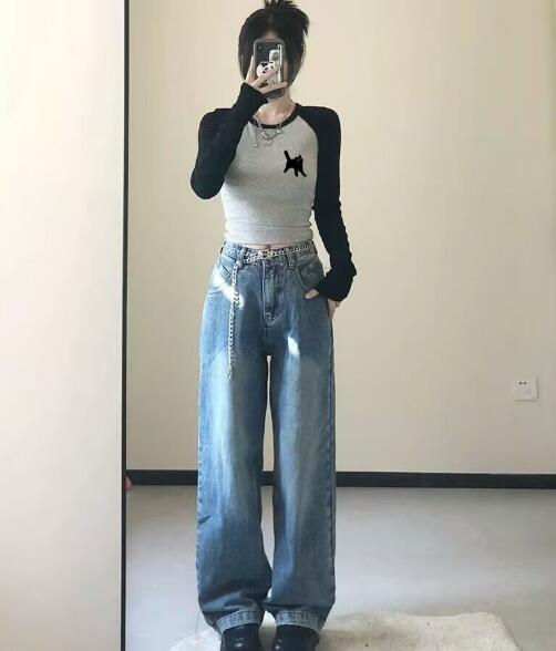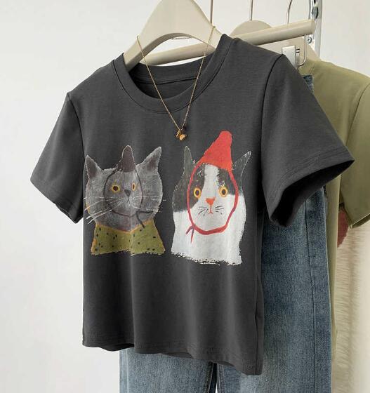♪~展開♪長袖トップスカットソーシャツインナー猫ネコ動物グレーダンス衣装ヒップホップレディースガールズストリート個性的奇抜可愛い韓国
