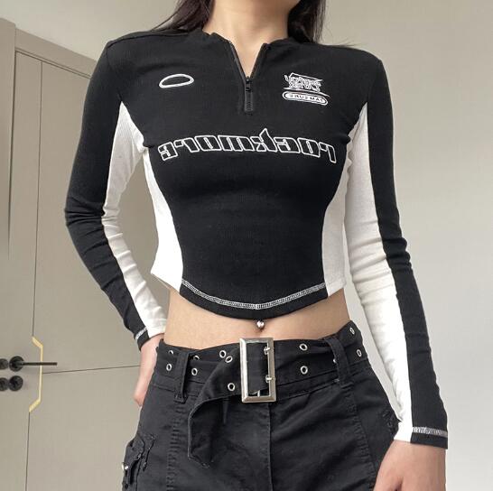 ♪M~XL展開♪ハーフジップラインロゴショート丈トップスカットソー長袖短い肌見せセクシーへそ出しボディーラインダンス衣装ヒップホップHIPHOPレディースガールズ大人ストリートTシャツ韓国おしゃれ奇抜
