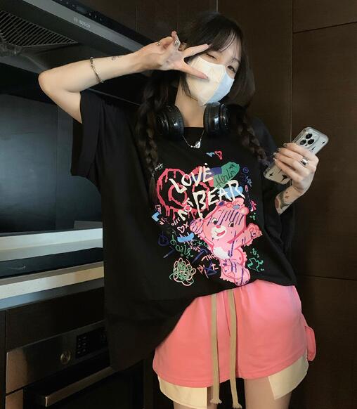 2カラービッグプリントTシャツトップスカットソー半袖五分袖大きいサイズビッグゆったりカラフルアメリカンダンス衣装ヒップホップHIPHOPレディースガールズストリート個性的韓国可愛い