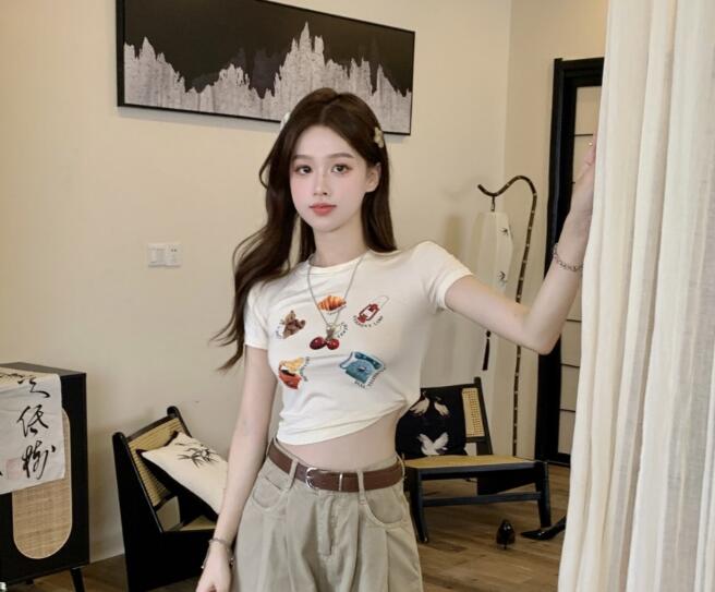 ♪-展開♪レトロ半袖トップスカットソーシャツ短め短いベージュシンプルダンス衣装ヒップホップレディースガールズストリート個性的奇抜大人韓国