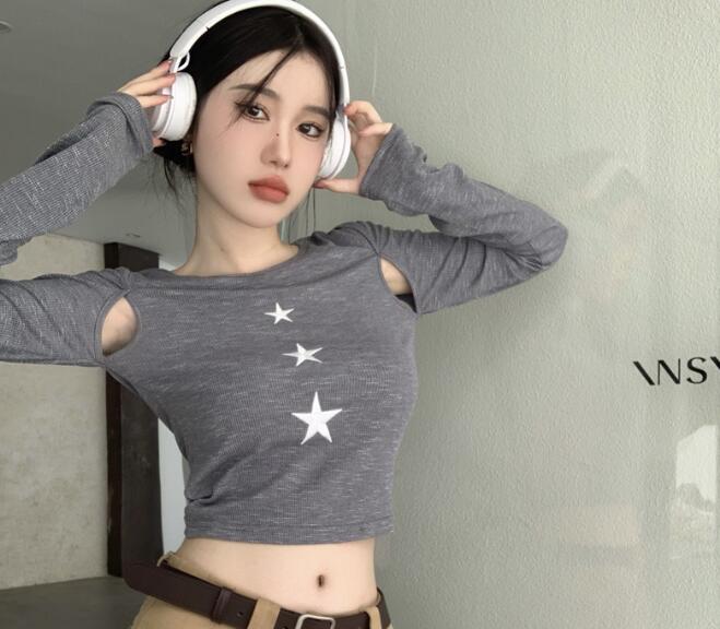 星柄刺繍長袖トップスカットソーTシャツへそ出し短め短いグレーシンプルダンス衣装ヒップホップHIPHOPレディースガールズストリート個性的奇抜大人韓国春夏秋