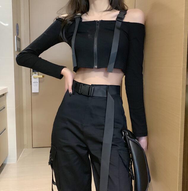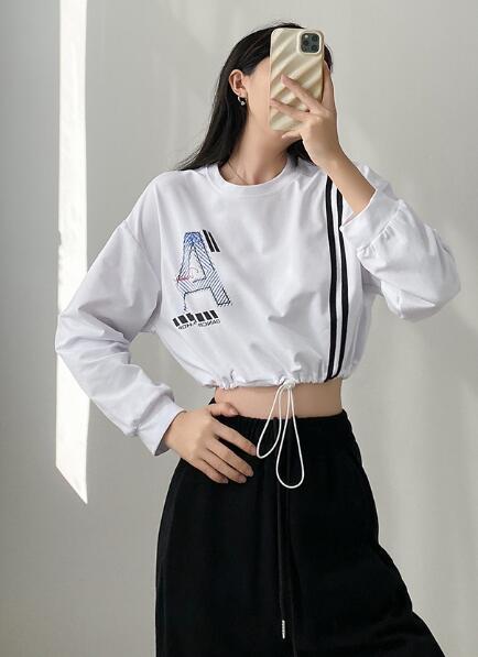 トップスカットソー シャツ長袖ショート丈 短め短いへそ出し絞りダンス衣装 ダンス イベント文化祭 コスチューム 韓国ファッション ヒップホップ レディースガールズ 個性的