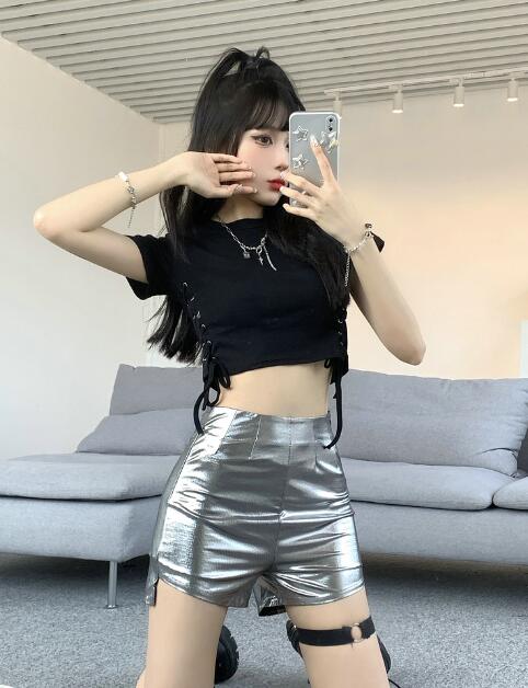 トップスカットソー半袖チェーン短めへそ出し短いシャツダンス衣装ヒップホップレディースガールズストリート個性的奇抜派手韓国おしゃかっこいい