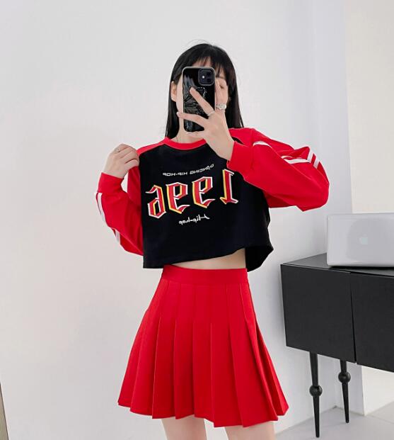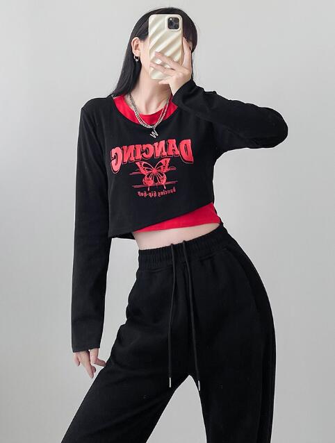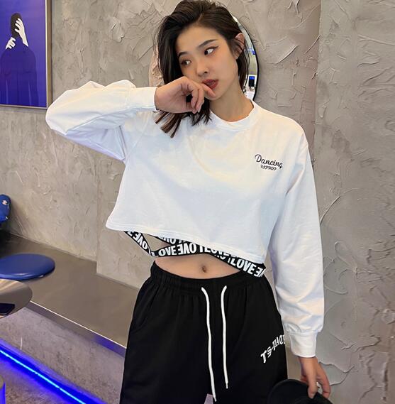 2色トップスカットソー tシャツ長袖ショート丈 短め短いへそ出しダンス衣装 ダンス イベント文化祭 コスチューム 韓国ファッション HIPHOP ヒップホップ レディースガールズ 個性的