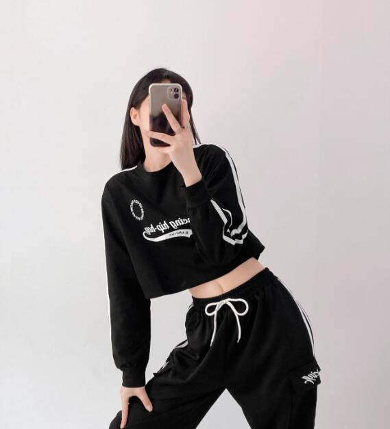 ライン長袖ショート丈短い短めへそ出しセクシーロゴダンス衣装ヒップホップHIPHOPレディースガールズストリートスケーター韓国おしゃれ奇抜派手部活イベント文化祭ダンス衣装