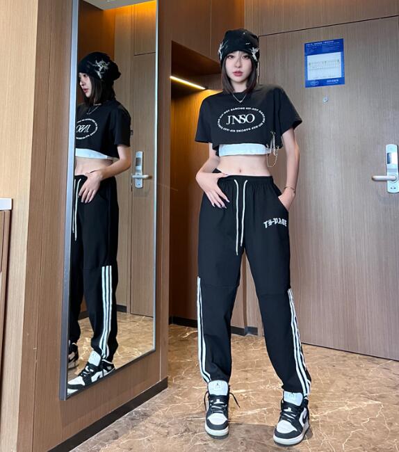 半袖ショート丈短い短めへそ出しセクシートップスダンス衣装ヒップホップレディースガールズストリートスケーター韓国おしゃれ奇抜派手 ブラックダンス衣装