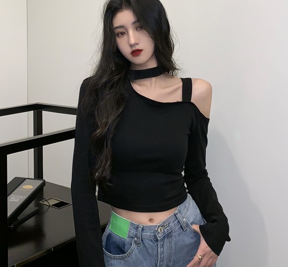 肩出しアシンメトリートップスカットソー無地ブラック黒シャツキャミソール長袖シンプルショート丈短い短めへそ出しセクシーダンス衣装ヒップホップレディースガールズストリート韓国チョーカーおしゃ