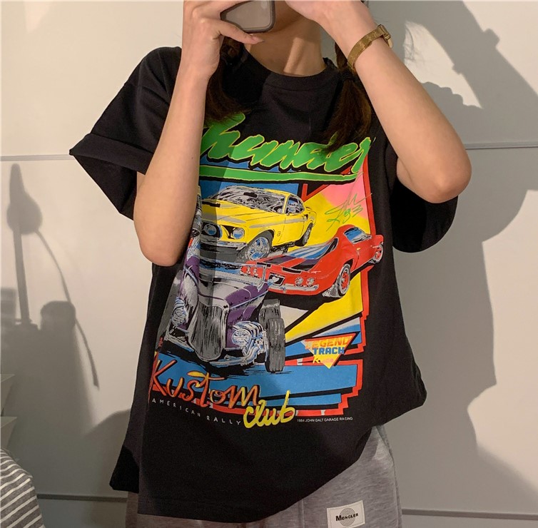 ロゴカラフルシャツ2色半袖トップスカットソー車スポーツカー黒ブラック白ホワイトダンス衣装ヒップホップレディースメンズガールズストリート個性的蛍光色ヴィンテージ風古着風旧車外車奇抜派手大き