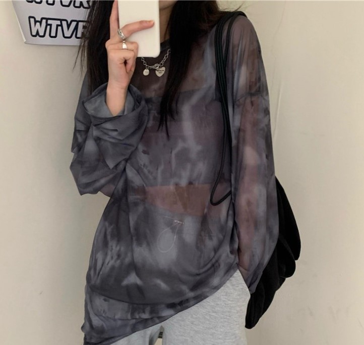 シースルータイダイ柄トップスカットソー長袖薄手透け感シャツグレーレディースメンズガールズダンス衣装ヒップホップ韓国おしゃれかっこいい大きいビッグストリートマーブル個性的服