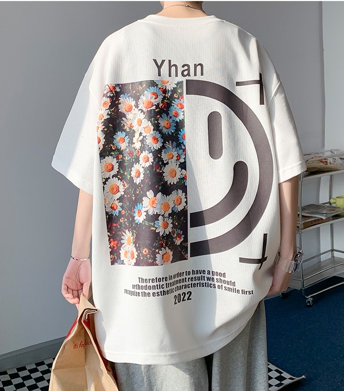 スマイルシャツ3色半袖トップスカットソー花柄フラワーロゴニコちゃんダンス衣装ヒップホップレディースメンズガールズストリート個性的奇抜白ホワイト黒ブラックグレーカラフルプリント韓国
