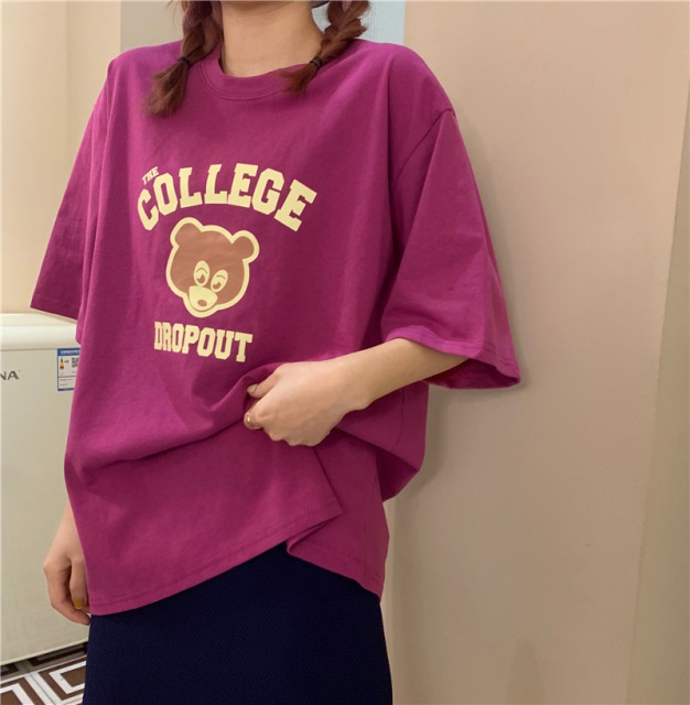 くまベアTシャツ4色ロゴ半袖トップス大きい大きめビッグピンクオレンジ白ブルーグリーンレディースガールズダンス衣装ヒップホップHIPHOPメンズ韓国奇抜派手お揃い通学服プリント個性的ストリートビッグ