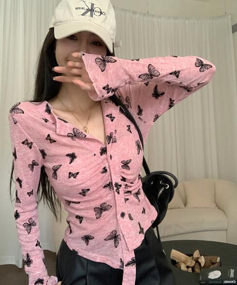 ♪~展開♪ちょうちょ長袖トップスカットソーシャツインナー薄手ピンクダンス衣装ヒップホップレディースガールズストリート個性的奇抜可愛い韓国