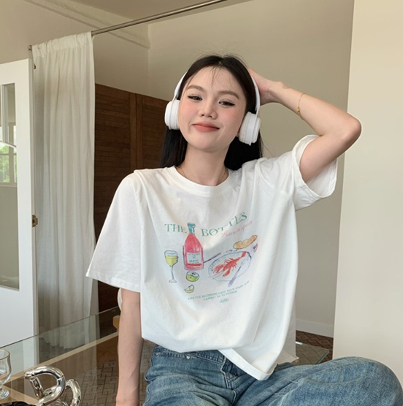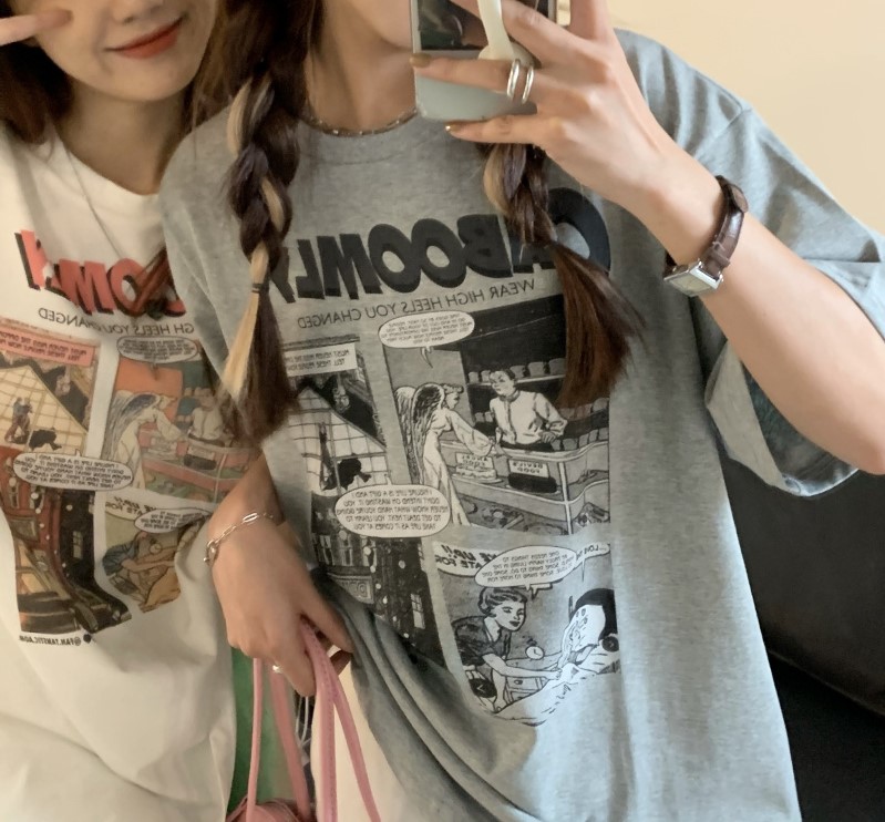 漫画風イラストTシャツ2色半袖トップスカットソーダンス衣装ヒップホップHIPHOPレディースメンズガールズ白ホワイトグレーロゴ外国絵本ストリート大きいビッグ個性的服おしゃれかっこいいコミカル外人カラフ
