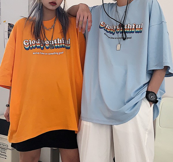 ロゴプリントシャツ2色半袖五分袖カットソートップスカラフルダンス衣装ヒップホップレディースメンズガールズストリート古着風ヴィンテージ風服個性的奇抜派手レトロビッグゆったりおしゃれ