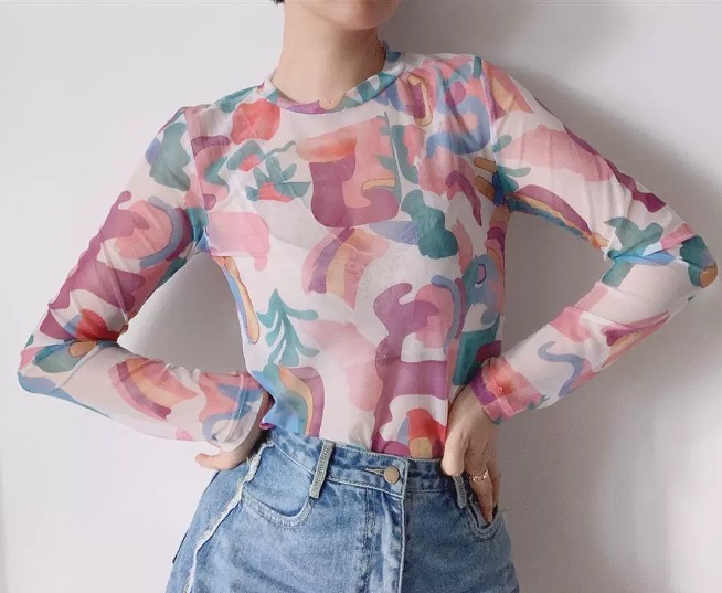 シースルーカラフルトップスカットソー長袖透け感シャツインナー薄手ダンス衣装ヒップホップレディースガールズストリート個性的奇抜派手総柄韓国おしゃれかっこいい