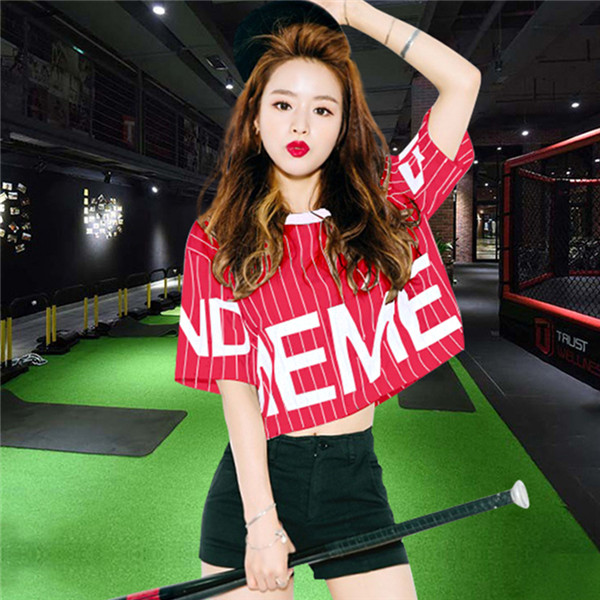ロゴボーダーストライプトップスカットソーシャツ半袖へそ出しショート丈短い短めレッド赤ダンス衣装ヒップホップレディースガールズストリート個性的奇抜派手韓国原宿おしゃれスケーター総柄