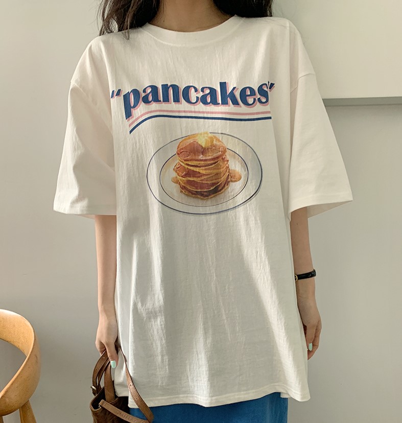 パンケーキシャツトップスカットソー半袖五分袖ロゴ白ホワイトダンス衣装ヒップホップレディースガールズ食べ物お菓子スイーツ大きいビッグゆったり服プリント韓国おしゃれ可愛いケーキガーリー