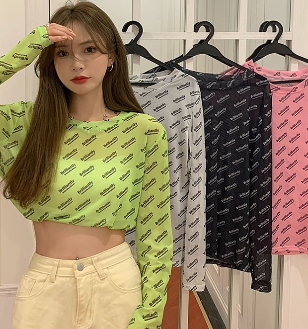 シースルーロゴトップスカットソー長袖透け感シャツインナー薄手ダンス衣装ヒップホップレディースガールズストリートカラフル個性的奇抜派手総柄蛍光色韓国おしゃれかっこいい白黒緑ピンク