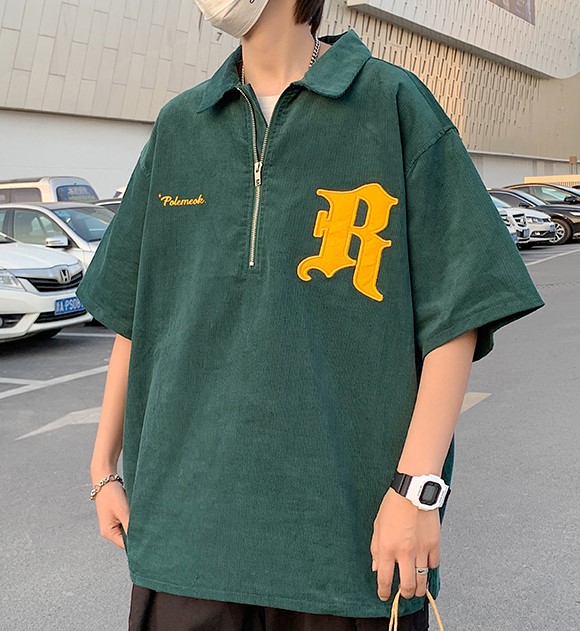 ハーフジップトップス3色ロゴ半袖カットソーシャツシンプルポロシャツジップアップ緑黒ブラックブラウンダンス衣装ヒップホップレディースメンズガールズストリート個性的奇抜韓国大きいサイズビッグ