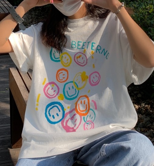 スマイルカラフルTシャツ2色半袖トップスカットソーロゴニコちゃん白ホワイトグレー大きいサイズゆったりダンス衣装ヒップホップHIPHOPレディースメンズガールズストリート奇抜派手韓国おしゃれ可愛い