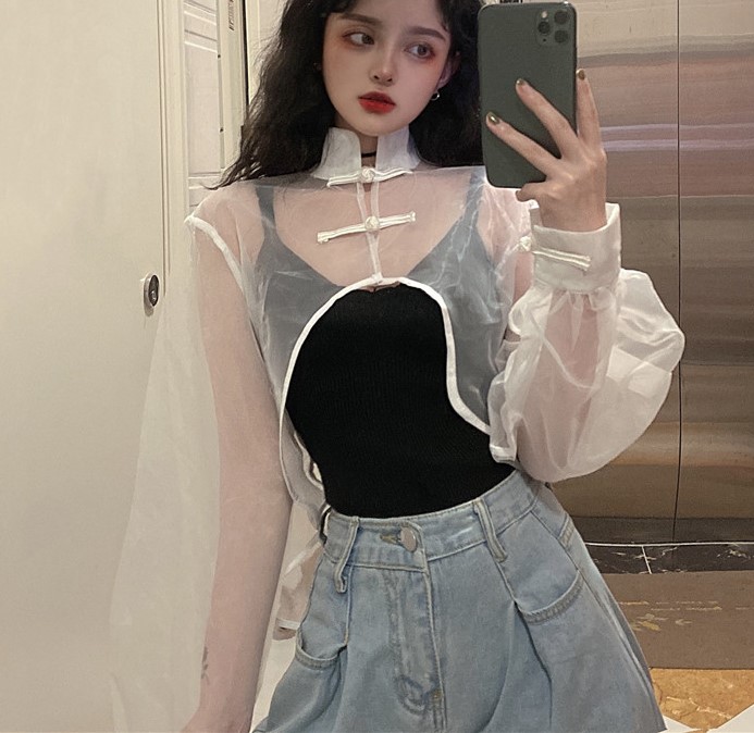 2色シースルーショート丈トップスカットソー長袖白ホワイト黒ブラック無地シンプルチャイナ服短い短め透け感タートルネックハイネックへそ出しセクシーダンス衣装ヒップホップレディースガールズ
