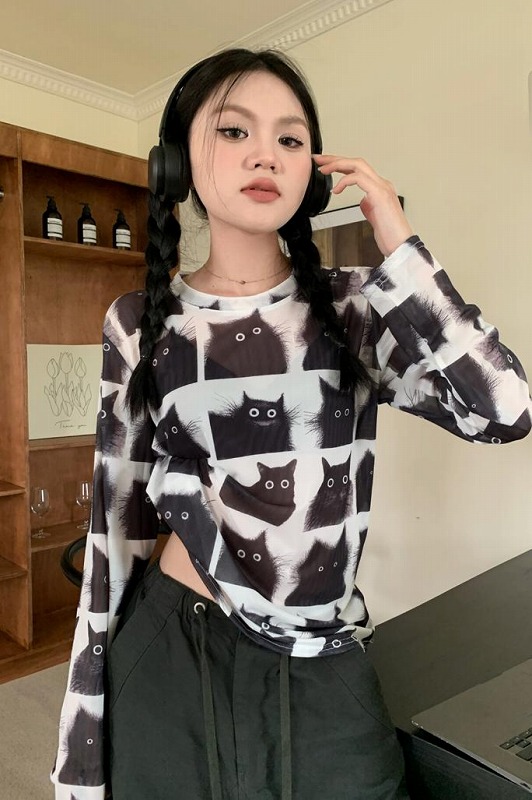 月柄3色シースルートップス長袖カットソー薄手透け感Tシャツインナー重ね着ダンス衣装ヒップホップHIPHOPレディースガールズストリート個性的スター星韓国おしゃれセクシーメロウメロー白黒緑総柄