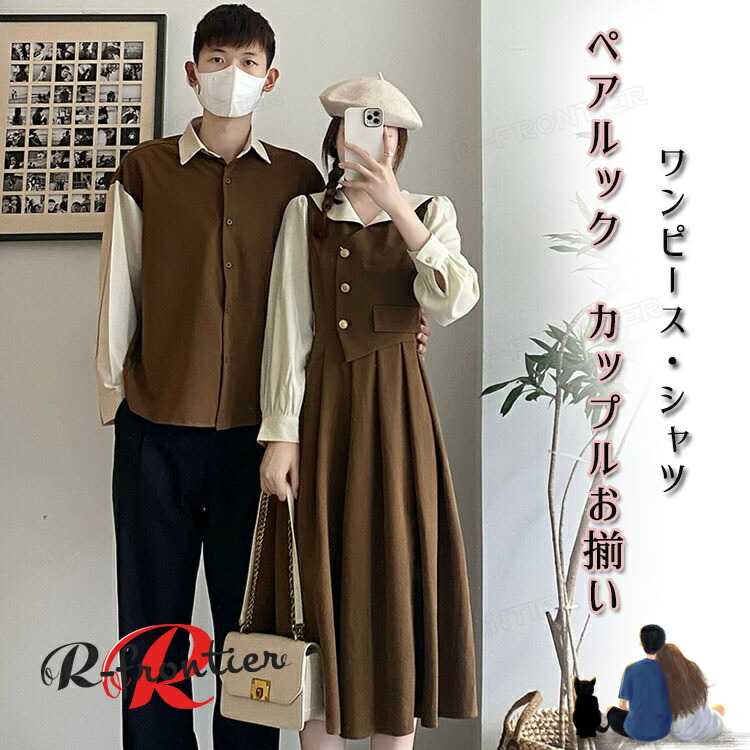 カップル ペアルック ワンピース ペアシャツ 長袖 カップルお揃い 春秋 レイヤード風 韓国 おしゃれ