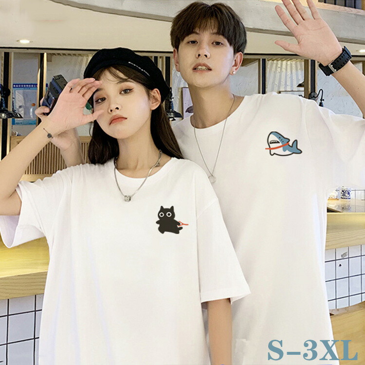 ペアルック t シャツ シンプル ネコ カップル お揃いtシャツ 大きいサイズ tシャツ 黒 白 大きいサイズ オーバーサイズ
