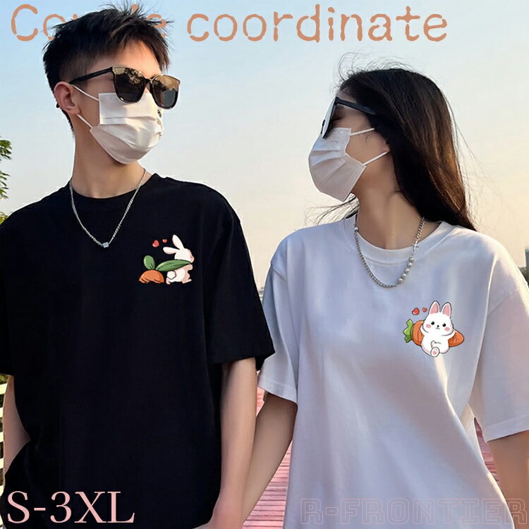 ペアルック ウサギ Tシャツ カップル ペアtシャツ カップルお揃い ピンクウサギ お揃い服 黒 白 大きいサイズ 可愛い