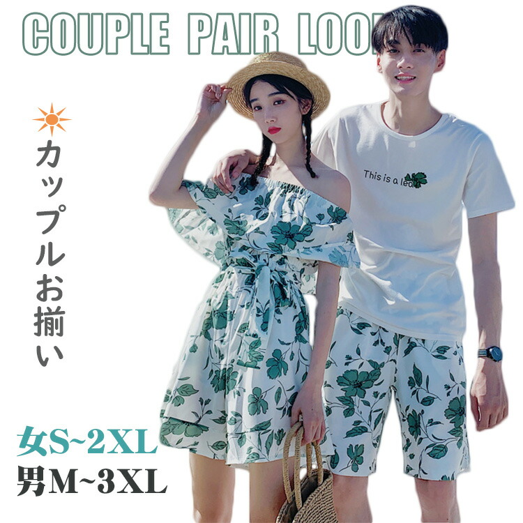 アお揃い ワンピース 海遊び ペアシャツ オフショルダー 夏休み ペアルック カップル シャツ パンツセット