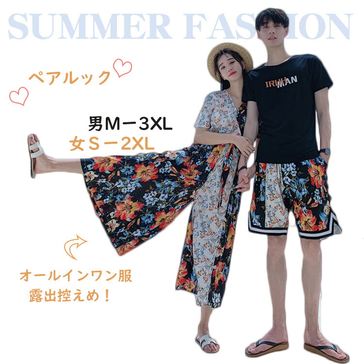 ペアお揃い オールインワン服 ポへミア ワンピース 海遊び ペアtシャツ 露出控えめレディースファッション トップス Tシャツ カットソー