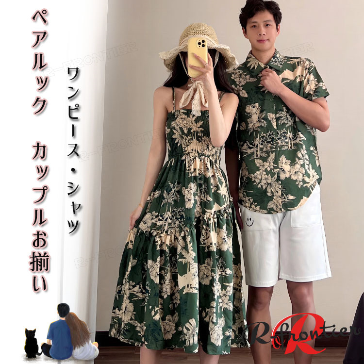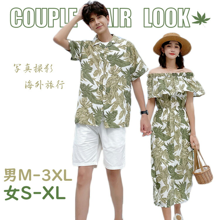 ペアお揃い ペアルック カップル ワンピース ペアシャツ オフショルダー 花柄 ハワイ 海リゾート 海遊び 沖縄 旅行 夏休み 家族活動
