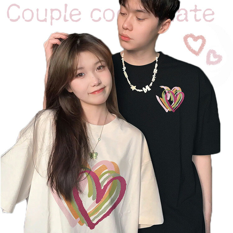 ハート Tシャツ カップル ペアtシャツ ペアルック カップルお揃い 英語字 お揃い服 黒 白 大きいサイズ オーバーサイズ