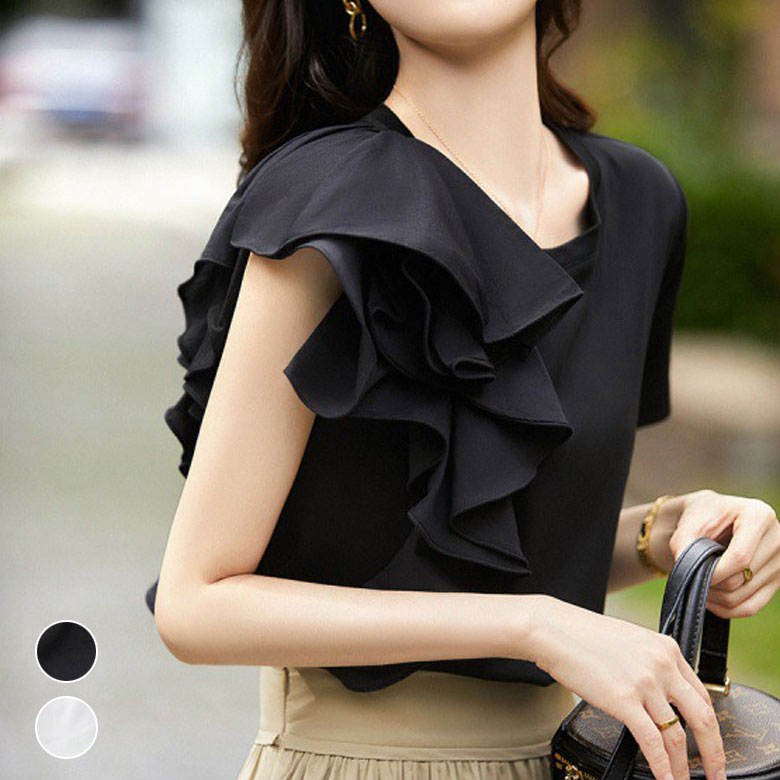 アシンメトリー フリル シャツ アシメ 半袖 カットソー 白 黒 ホワイト ブラックレディースファッション トップス シャツ カットソー