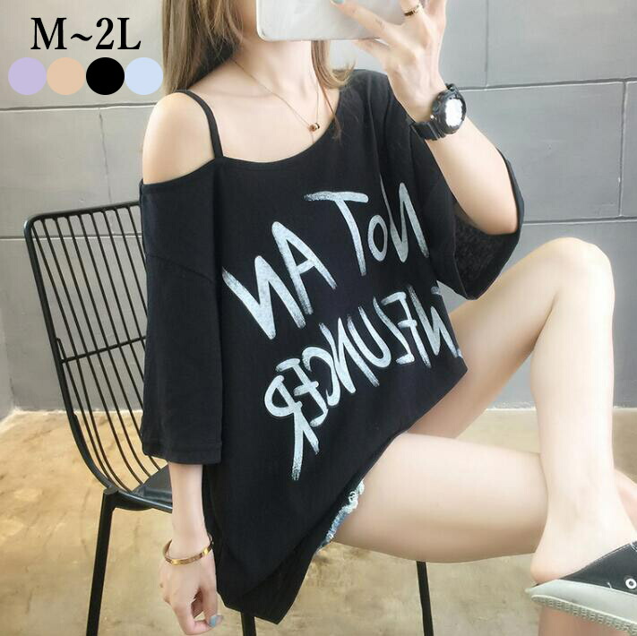 オフショルダー 肩だし 肌見せ ロゴTシャツ Tシャツ チュニックプリントロゴ半袖ロングTシャツトップスレディースゆったり大きいサイズ肩開き オフショル 半袖夏体型カバー M L2L