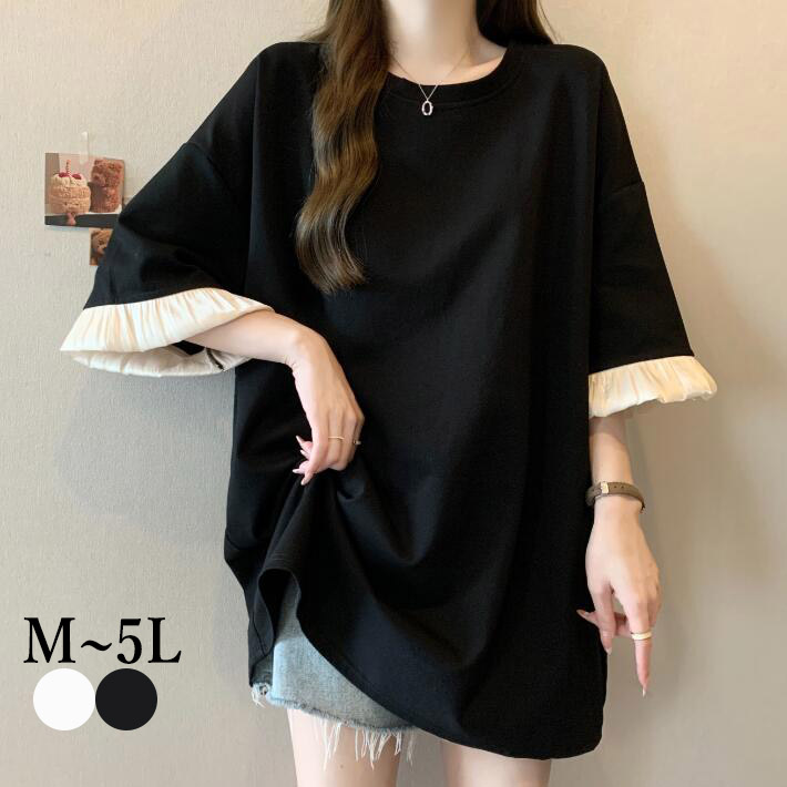 Tシャツ レディース 半袖 夏 切替 ロング フリル袖 ゆるTシャツ カットソー クルーネック ビッグシルエットカジュアル シンプル 大きサイズ M L 2L 3L 4L 5L