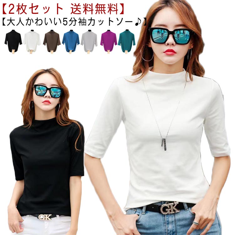 半袖 ハイネック シャツ 薄手 五分袖 レディース ハイネックシャツ 無地 ゆったり 薄手 シンプル カットソー