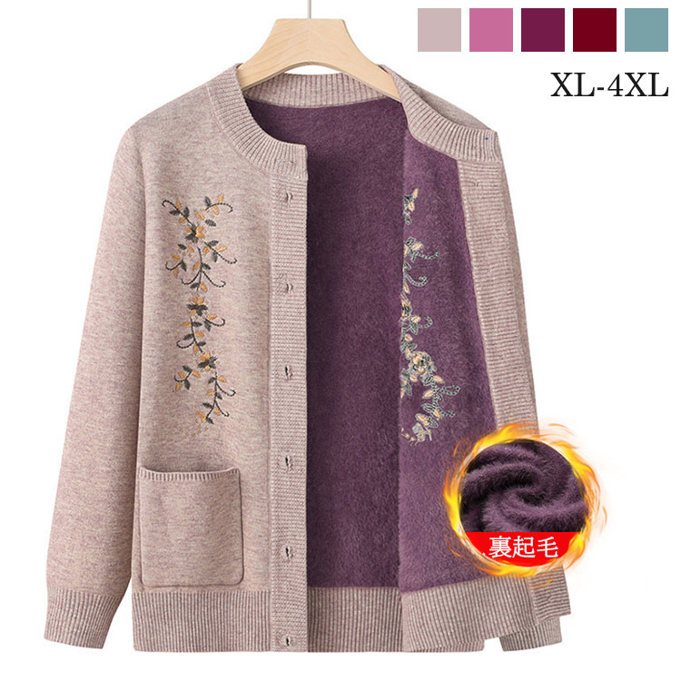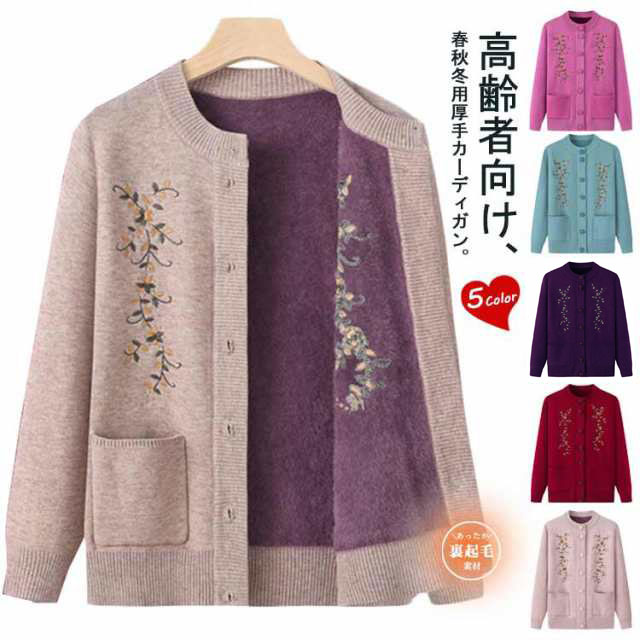 秋冬 おばあちゃん用裏起毛ニットカーディガンです 保温効果は抜群 パープル キャメル色 ワインレッド グリーン ピンク